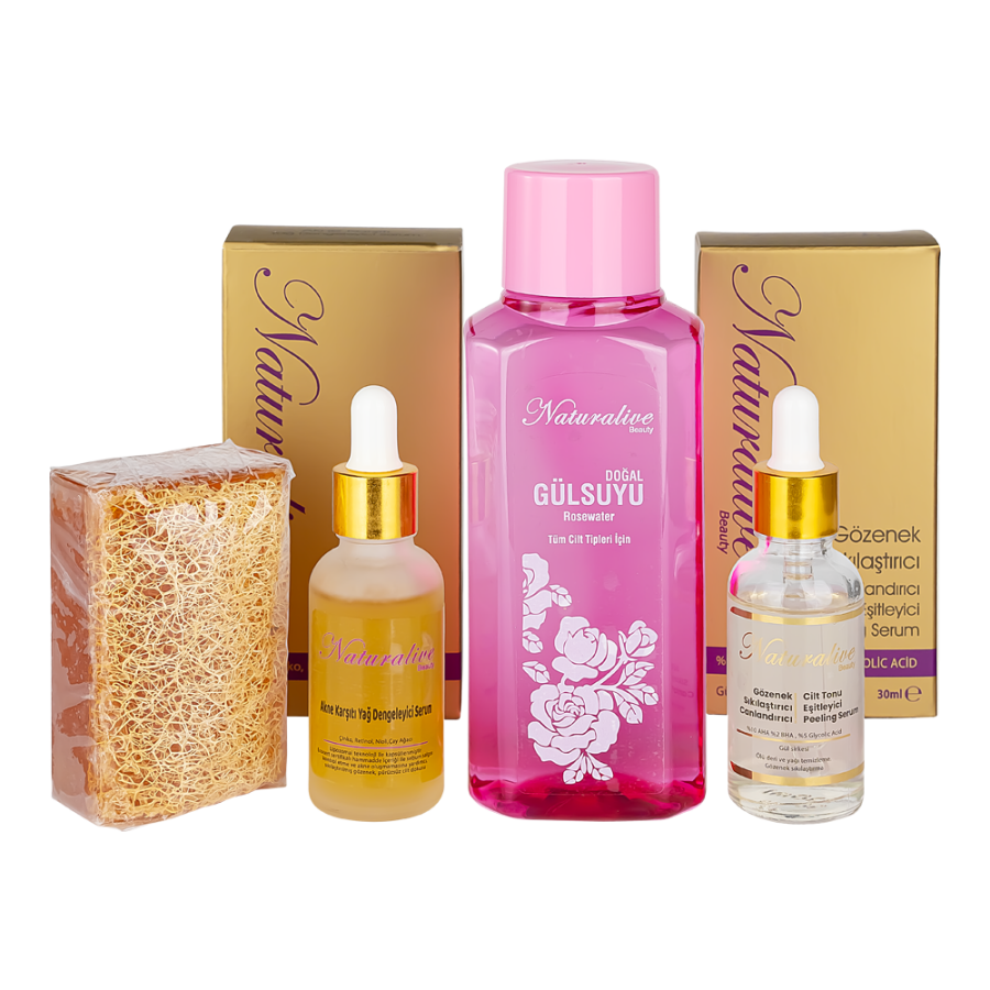 Naturalive Akne Cilt Bakım Seti ile yapacağınız bakım rutini akne ve siyah nokta oluşumunuzu azaltmaya, cildinizdeki kızarıklık ve tahrişi azaltmaya, gözenekleri sıkılaştırmaya ve cildinizin yenilenmesine yardımcı olur.